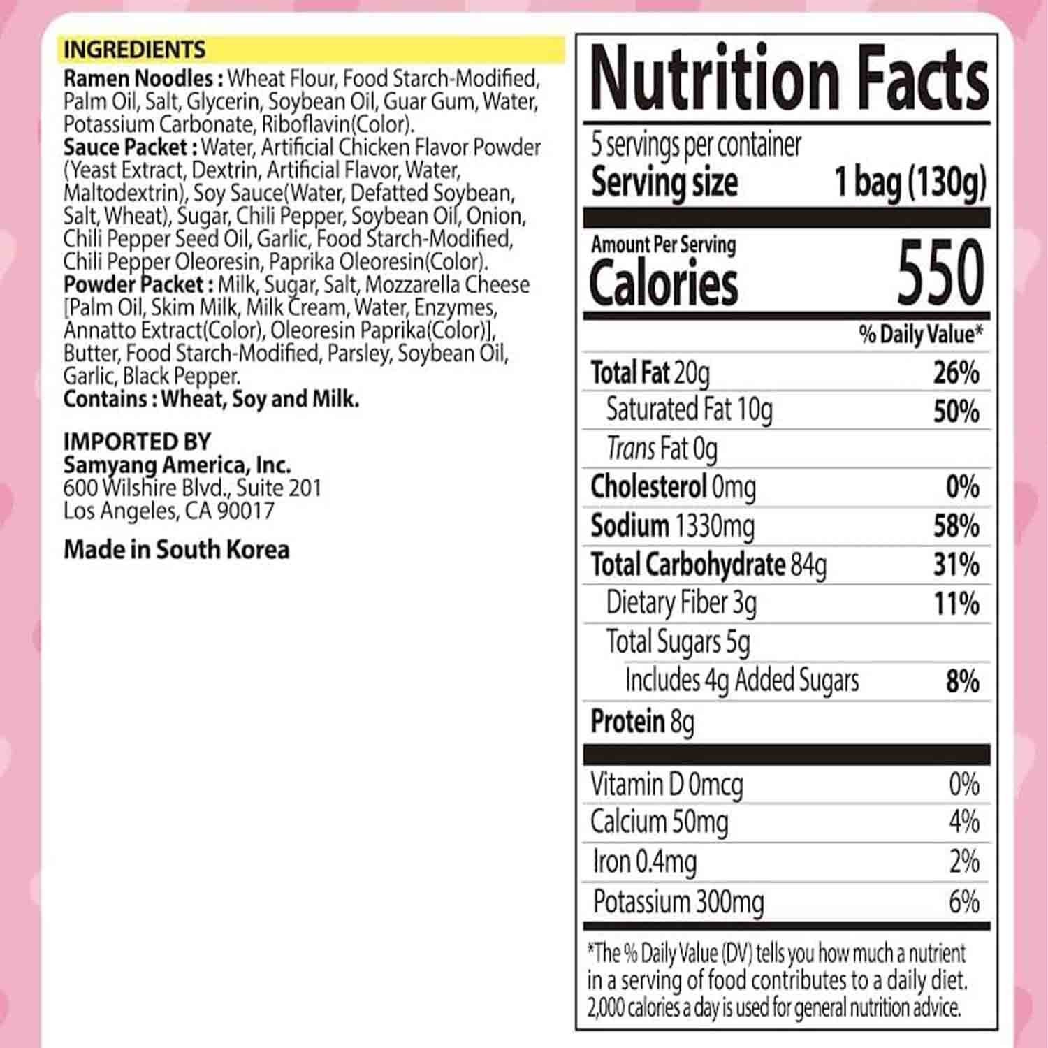 INGREDIENTS Noodle (77.5%): Wheat flour (Contains: Gluten), Thickener: (E1420, E412), Palm oil, Salt, Emulsifier: [E422, E322 (Contains: Soy)], Soybean oil, Acidity regulator: (E501, E500, E339, E330), Water, Tocopherol powder (Contains: Soy), Green tea extract, Colour: E101 Liquid soup (12.7%): Water, Artificial chicken flavouring (Contains: Wheat, Gluten), Soy sauce, Sugar, Chili pepper, Habanero pepper, Soybean oil, Onion, Chili pepper seed oil, Garlic, Thickener: E1420, Chili pepper oleoresin, Colour: E160c, Black pepper, Curry seasoning (Contains: Celery) Powder (9.8%): Whole milk, Milk, Sugar, Salt, Butter seasoning (Contains: Milk), Mozzarella cheese (Contains: Milk), Thickener: E1420, Curly parsley, Soybean oil, Garlic, Black pepper Manufactured in a facility that also processes Crustaceans, Eggs, Fish, Molluscs, Mustard, Nuts, Peanuts, Sesame seeds.